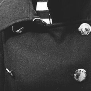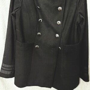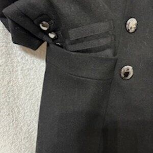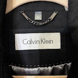 Calvin Klein black wool blend double breasted pea coat with ten polished pewter buttons (five on each side of the front) and five functional/working pewter buttons on each sleeve. Each sleeve has three rows of grosgrain 'ribbon' that adds to the military style and the back side has a 2" wide belt secured at the lower back area by two larger pewter buttons. Made with 61% wool, 31% polyester, 3% nylon and 4% fiber with a beautiful satiny feeling lining in 100% polyester. Beautiful rounded collar with pewter hook clasp for extra protection around the neck on cool or windy days. Measures appx 29-1/2" from shoulder to hemline. The square pockets on either side of the front measure about 6-1/2" wide by 8-1/2" high. Sleeves measure appx 25-1/4" from shoulder seam to end of sleeve and bust measures about 18-1/2" across, lying flat when buttoned. Never been worn - new without tags but has a spare button attached to the interior tag that feels like it contains a replacement button to the front, 1" diameter, double breasted buttons.