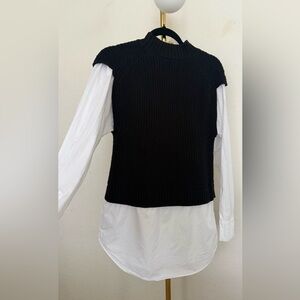 Calvin Klein black sweater vest layered over white long-sleeve button-down shirt