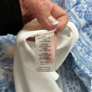 Absolutely adorable dress. Mini/midi length depending on height. See pics for measurements. Sleeveless. Halter with tie and zipper on back. Lined. Tiered. Drop waist. Gorgeous classic blue and white pattern. This is in excellent shape. There is one pulled thread on center back. See pic for documentation. Otherwise no visible flaws. This has been worn but is in great shape.
