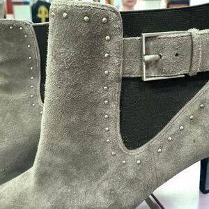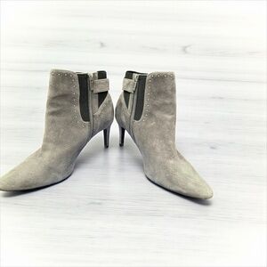 The Calvin Klein booties are a stylish and sleek choice for women looking to elevate their footwear collection. Made from gray suede with a 3-inch heel, these booties are perfect for adding a touch of sophistication to any outfit. The Calvin Klein brand ensures quality and fashion-forward design, making these boots a versatile and chic addition to your wardrobe. Note the decorative accents around the shaft which makes these shoes unique and stand out. Barely worn, suede in like new condition, plus I use conditioner so no water marks or any stains on any of my suede collection. The heel is very comfortable and the color is beautiful, very hard to find. It matches my grey Cole Haan purses and my winter wool coat listed on my side. There is also great matching belt (size small), see my other listing, which I can add for additional $3.