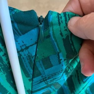 Back zip. Fits like a dream. Gorgeous green and blue abstract. A closet staple