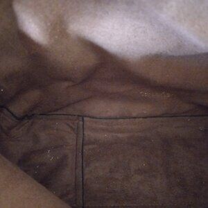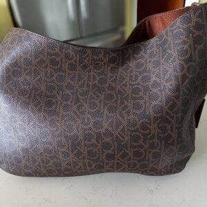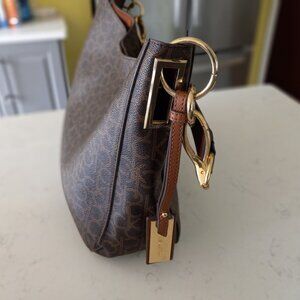 Calvin Klein brown Signature with leather shoulder strap attached by gold tone hardware and dark brown suede interior. There are no interior pockets.