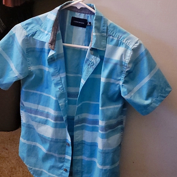 blue horizontal striped cotton Boys Calvin Klein button down short sleeve size medium