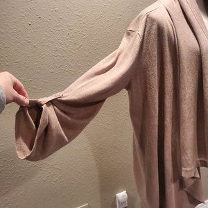 This beige Calvin Klein open-front cardigan is in good condition. The material (cotton, viscose, nylon) is soft and stretchy. It has large, cascading lapels. Given all the fabric on the front of this garment, I turned it over and loosely laid it out flat to measure length and width. (See photos) The fabric is in good shape, although there is a very small hole on the back that is not visible when you're wearing it. (See photos for details.) It has been priced accordingly.