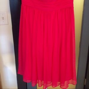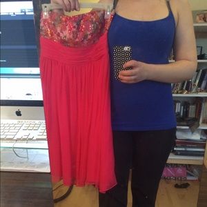Pink chiffon strapless dress with sequence detail, I'm 5'6 and it hits right above the knee.