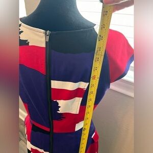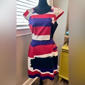Pre owned Calvin Klein lined dress w/ front zip pockets, back zip closure. Cotton poly blend. Vibrant red, purple, black and white. Cute cap sleeves. Vintage. Approx 37" length