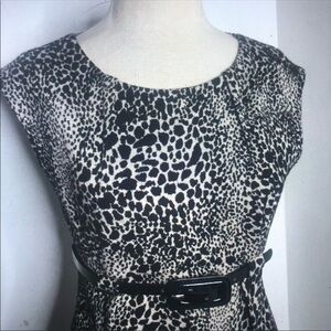 Calvin Klein leopard print dress with belted empire waist ,back zip for easy on and off removal ,black patent leather belt short sleeve with crew neckline small black slit for easy movement