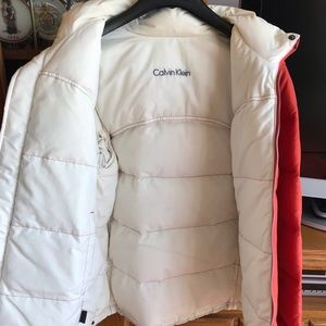 Super cute reversible down jacket. Redish/orange and white. Calvin Klein. Tag removed to wear it reversible but probably a M or L. Great condition.