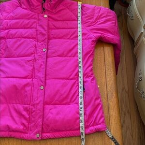 Brilliant Cabin Klein down jacket; in next to new shape; super warm; many pockets; zip hand warmer pockets; inner large pocket; media pocket; full 2 way front zip: lower edge elastic; pit zips ; adjustable hood that tucks into collar. Polar fleece lining; down insulated. Ski ticket holder.