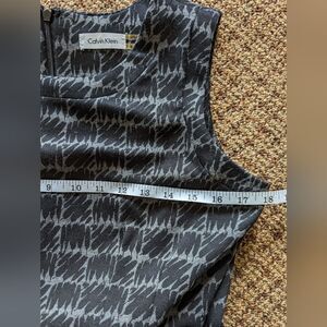 Elevate your work wardrobe with this elegant Calvin Klein dress in a stylish gray geometric pattern. The dress features a sleeveless design, round neckline, and a zip closure. It is made of a blend of polyester, spandex, and rayon for a comfortable fit.