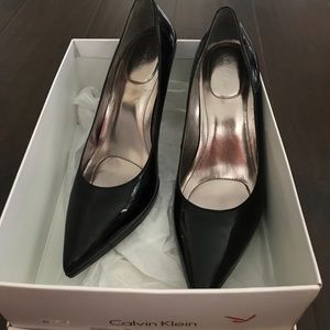 Shiny black, pointed toe, 7.5 sized Calvin Klein heels! Never worn, only tried on!