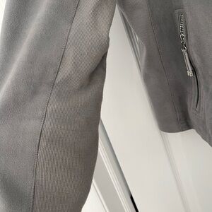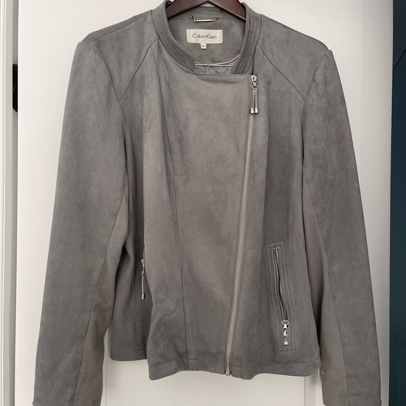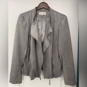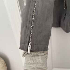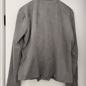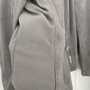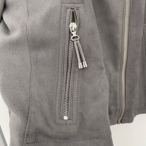 Faux suede Moto jacket size XL; working zippers on cuffs and pockets; ribbed, elasticated panel on arms and sides of jackets for comfort while wearing and enhances fit.