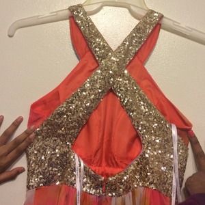 Coral, orange and lilac with golden sequins. Willing to negotiate price. Brand new. Never worn. Thought I would wear it in Vegas, never got a chance.