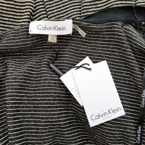 Calvin Klein cardigan in a gold and black striped pattern. It is new with tags but tags got ripped off. It is a long sleeve, open front cascading cardigan with a contrasting trim on the bottom and cuffs. It has a shimmery thread on the gold stripes.