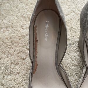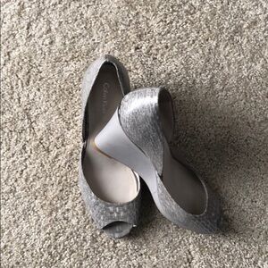 These are Calvin Klein peep toe wedges with a snakeskin gray pattern in size 9.5. They fit true to size. Some of the salt is coming off but does not affect wear of shoe. Smoke-free home.