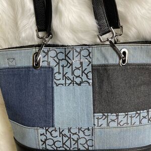 Calvin Klein gray and Bleu denim logo with black synthetic trim large tote with silver tone hardwares magnetic snap closure pre owned in n good used condition small transfer marks around the bag see all pictures any questions please message G5