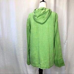 Calvin Klein 100% linen light grass spring green hoodie with 1/4 zip. Zippered kangaroo pocket and drawstrings at hood and bottom hem. Straight, wide sleeves. Slightly longer in back. This is the perfect summer layer! Excellent pre-owned condition, no flaws noted.