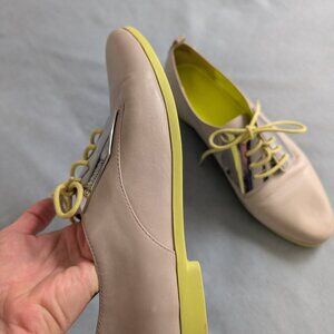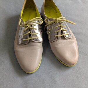 Elephant grey oxfords with polished silver quarters and neon soles and laces. These beautiful shoes are unique. True to size. GUC, do show some signs of wear on soles.