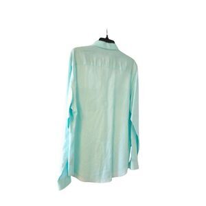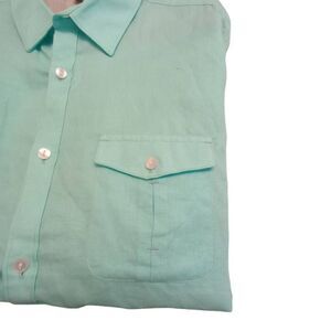 Pre-owned ocean blue linen & cotton blend long sleeve button down shirt. Could be worn casual or formal/business. Beautiful color of blue, two pintuck breast pockets. Buttons on sleeves so can be made into a 3/4 sleeve shirt.