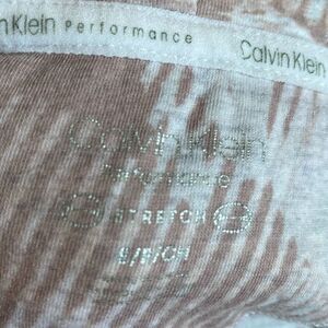 Calvin Klein long sleeve shirt in tan and light gray abstract pattern, drawstring hood, “Calvin” logo across front, and black and white stripes down sides. The fabric tag has been removed. Otherwise good condition!