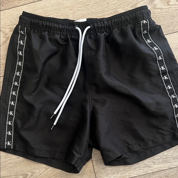 Stylish black swim shorts/swim trunks featuring CK logo trim. Perfect for sports or leisure.
