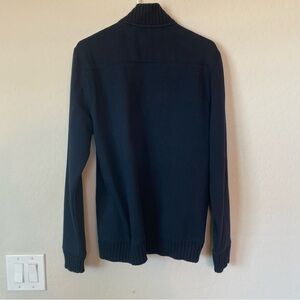 This long sleeve zip up sweater is in great pre-owned condition. It has two inside pockets, two zip pockets on the upper chest and side pockets on the side. The sleeves, collar and waist are ribbed giving it a classy look and more dressed up. Very versatile and perfect weight for cooler fall and summer evenings. Armpit to armpit 20”, shoulder to hem 27”.