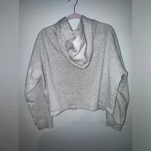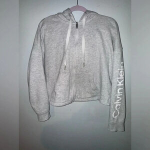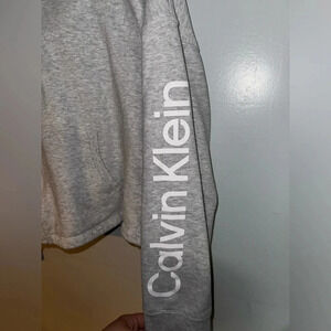 Cropped. Calvin Klein healthier grey hoodie with pocket’s. Calvin Klein on left sleeve going down.