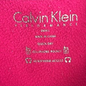 This Calvin Klein performance fleece zip-up jacket is a women's size small sweatshirt in pink color. It features a collared neckline, long sleeves, and a full zip closure. Made of polyester fleece, it has a solid pattern with a Calvin Klein logo accent on the front. Ideal for outdoor activities in winter, fall, and spring, this athletic fit sweatshirt includes pockets and is suitable for gym training, walking, and running.
