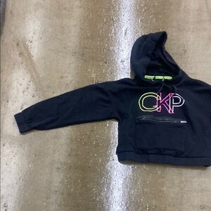 Stylish and comfortable black hoodie for woman sz XS crop top pull over black hoodie with CKP in colorful letters. I have only worn a hand full of times. Comes from a smoke free pet free home. Features a bold Calvin Klein logo on the front. Perfect for casual wear.