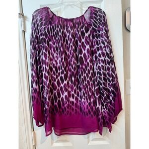 Calvin Klein plus size tunic style blouse size 1X. Purple, white black silky fabric with gold accent at neck. In excellent preowned condition.