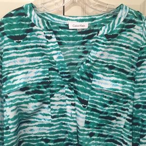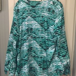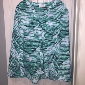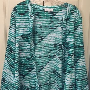 Green black and white. Two pockets on front. Cuffed. Can be worn open or closed