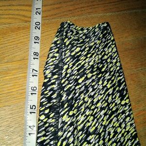 Black, yellow, gray and white patterned workout pants. Laying flat they measure 12" across w/ a 20" ruched leg inseam. An added waistline pocket for an ipod device, locker key or whatever.