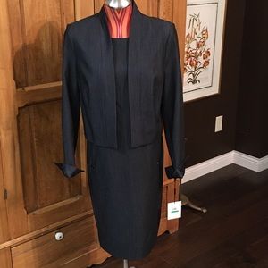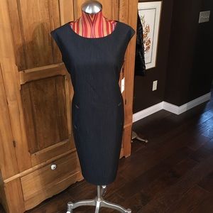 Calvin Klein sheath dress. Slight cap sleeve, seam pockets trimmed w/ silver bars, back pleat. Poly, rayon , spandex. Pair with matching crop jacket for stunning ensemble. Variegated navy blue