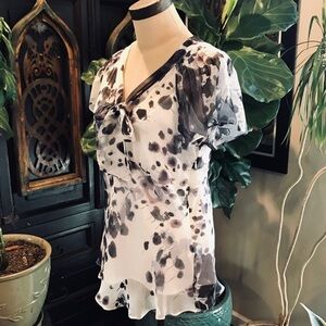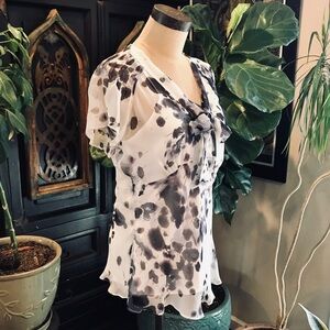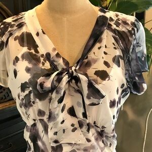 115. Calvin Klein silk top, sheer watercolor abstract floral bow tie top. small snaps on inside of shoulders to keep cami straps from sliding. Worn once, dry cleaned once. No damage, no stains. Excellent shape. Displayed on a size small dress stand.