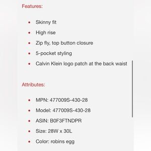 Stylish skinny jeans by Calvin Klein. Light blue color. Perfect for casual wear.