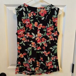 Calvin Klein sleeveless blouse/tank top with pleated neck line. Black with coral and green. Size large, excellent condition smoke and pet free home.