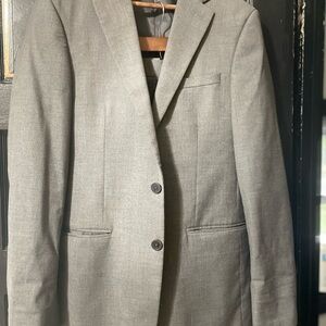 Calvin Klein slim fit suit. Pants: 36w and 32L measured from crotch to hem. Blazer: measurements from neck to sleeve hem is 34” back measured shoulder to shoulder 18”. In the picture my son is 5’11” and 220lbs