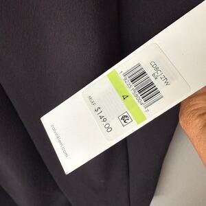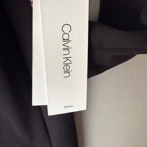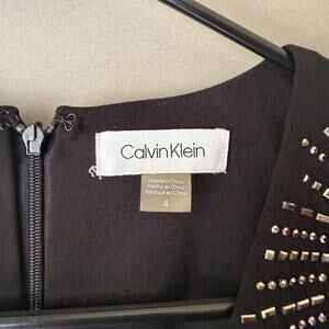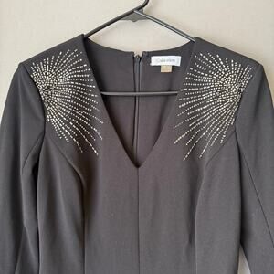 A black Calvin Klein dress (model CDC6127W, size 4) in a V-neck silhouette with long sleeves. The dress features silver embellishments on the shoulders. It's made from a 94% polyester and 6% spandex blend. The dress is in new condition with tags and shows no visible imperfections. The MSRP was $149.00.