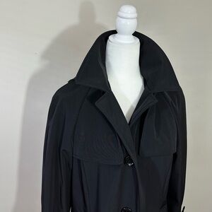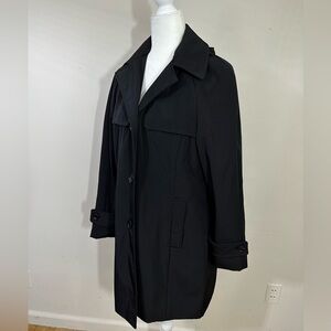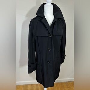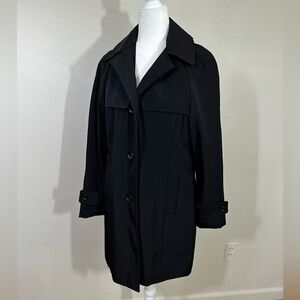 Exceptional all weather coat in black. Single row of buttons on the front Hood detaches. Semi dressy style. Pockets nearly new. Runs large measurements are pit to pit flatfold about 20 1/2”. The total length is about 35”. No visible flaws. Any questions please ask and we will answer questions ASAP. R 1