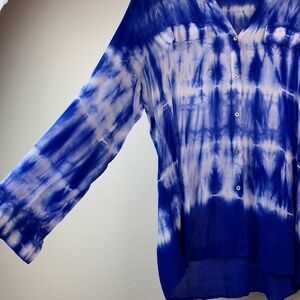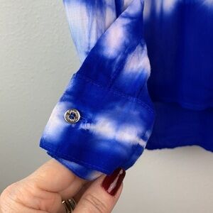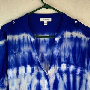 Calvin Klein nautical fresh blue and white tie dye print blouse with faux breast pockets. Beautifully draping rayon V neck convertible long sleeve sleeves, button down tunic top. In excellent condition with only two extremely faint marks in last two photos I found under the studio lighting.