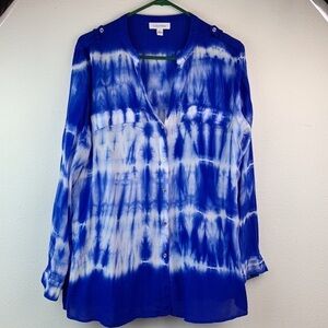 Calvin Klein tie dye draping rayon V neck long roll sleeve button down tunic top