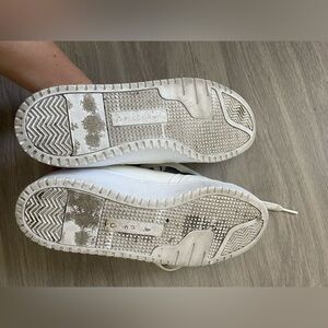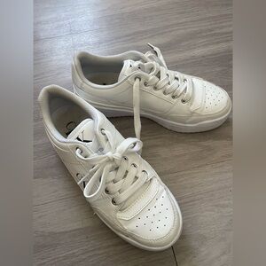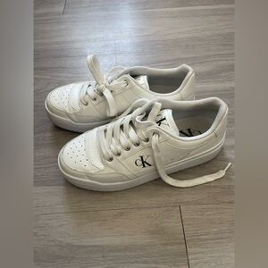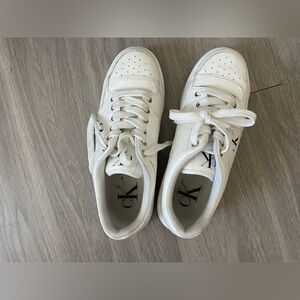 Step up your sneaker game with these trendy Calvin Klein Alondra platform sneakers in a striking white and black colorway. These sneakers are perfect for adding a touch of street style to any outfit. The size 8 fit ensures a comfortable and snug feel for all-day wear. The platform design adds a modern twist to the classic sneaker silhouette, giving you a boost of height and style. These sneakers are used but still in great condition, offering a unique and fashionable look that will elevate any casual ensemble. Don't miss out on the opportunity to own these stylish Calvin Klein sneakers that are sure to turn heads wherever you go.