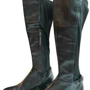 Calvin Klein women’s black leather boots size 6M. Wedge heel 2 inches. Very soft, black leather. Buckle at the top of the ankle for decoration. From the heel up in the back is very stretchy fabric. Front of ankle up to knee is black leather.