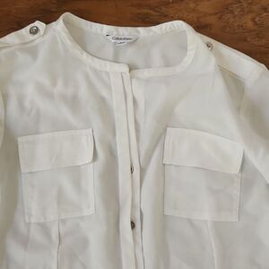 Professional white button front blouse by Calvin Klein. Women's size small/petite. The sleeves can be worn long or three quarter length.
