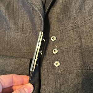 2 piece suit by Calvin Klein. Lovely shade of grey with bar press stud detailed fastener. See pics for measurements as no size in it but id say small.