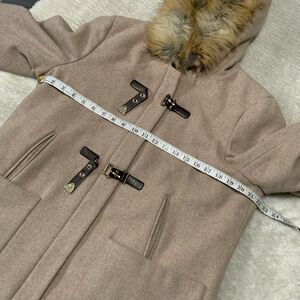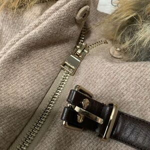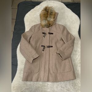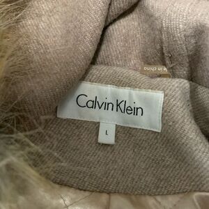 Calvin Klein Beige Wool Blend Full Zip Womens Coat Size Large Jacket Fur Hood