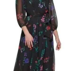 Calvin Klein Chiffon Multicolor Floral Black Long Sleeve Dress