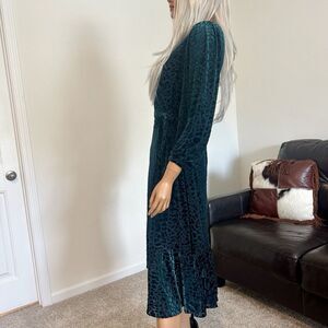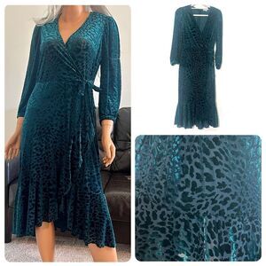 Calvin Klein burnout velvet wrap dress in a deep emerald green and black animal print. Features a flattering faux wrap silhouette with side tie detail, long puff sleeves with gathered cuffs, and a deep V-neckline. The fabric is rich and textured, with a semi-sheer overlay and a smooth inner lining. Finished with an asymmetrical ruffle hem that adds movement to the midi-length cut.