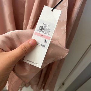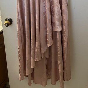 Faux-wrap silhouette and romantic ruffled high-low hem.