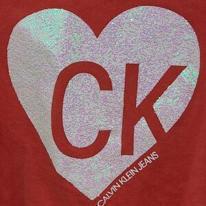 Top is short sleeves, raw hem, rolled sleeves, and oversized with a large Sparkly glitter heart with "CK"